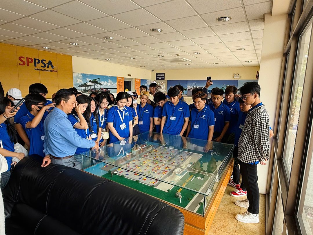 Tại SP-PSA, sinh viên được đại diện cảng tiếp đón, giới thiệu về mô hình vận hành cảng container quốc tế, hệ thống thiết bị bốc xếp, quy trình điều độ và giám sát hoạt động khai thác. Đặc biệt, sinh viên có cơ hội quan sát trực tiếp các công đoạn quản lý container, công tác kiểm soát an ninh, cũng như các ứng dụng công nghệ hiện đại đang được triển khai tại cảng.