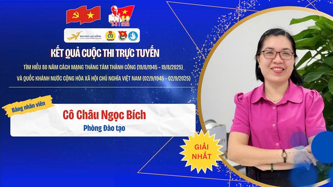 Chào mừng 80 năm Cách mạng tháng Tám thành công và Quốc khánh nước CHXHCN Việt Nam. Đảng ủy, Công đoàn, Đoàn Thanh niên và Hội Sinh viên Trường Đại học Lạc Hồng tổ chức Cuộc thi trực tuyến Tìm hiểu 80 năm Cách mạng tháng Tám thành công và Quốc khánh nước CHXHCN Việt Nam.