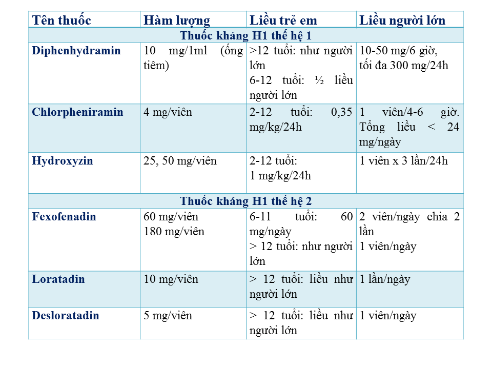 • Thuốc kháng histamin H1, là nhóm thuốc quan trọng trong điều trị các triệu chứng của phản ứng dị ứng do hóa chất trung gian gây ra. Một số thuốc: diphenhydramin, hydroxyzin, loratadin, fexofenadin, desloratadin... (bảng 1)