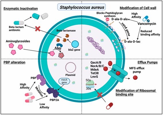 Rajput P, Nahar KS, Rahman KM. Evaluation of Antibiotic Resistance Mechanisms in Gram-Positive Bacteria. Antibiotics (Basel). 2024 Dec 8;13(12):1197. doi:10.3390/antibiotics13121197. PMID: 39766587; PMCID: PMC11672434.